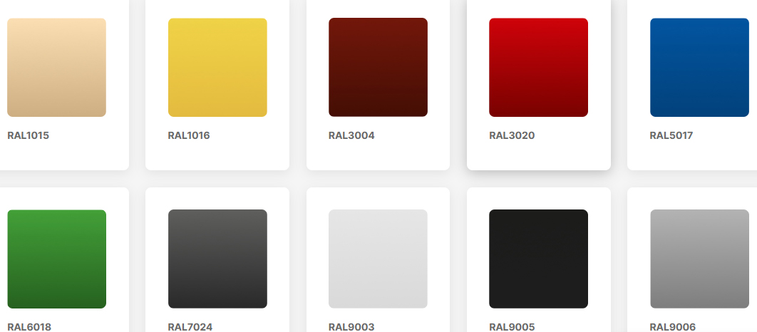 Доступна в 10 стандартных цветовых исполнениях фронтальной панели по таблице RAL: 9003, 9006, 9005, 3004, 7024, 1016, 6018, 3020, 5017, 1015.