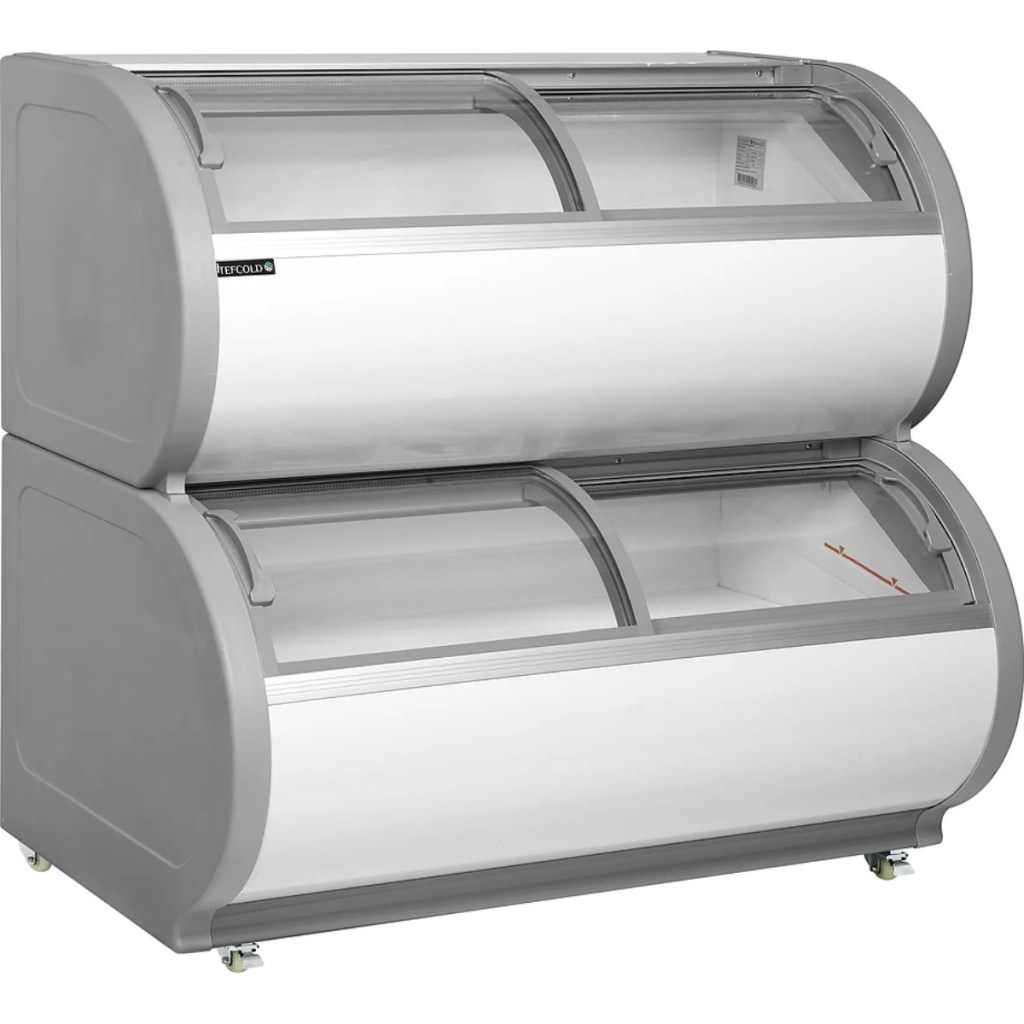 Ларь оснащён 2 уровнями морозильных камер, 4 гнутыми раздвижными дверьми из закаленного стекла, 10 корзинами, 4 колесами с тормозами на 2 из них и замком для безопасного хранения. Встроенная LED-подсветка с выключателем облегчает доступ к продуктам и повышает удобство работы.