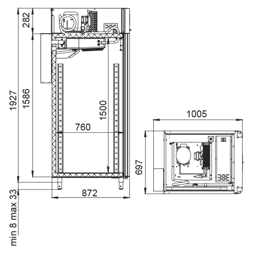 Каталог оборудования Холодильное оборудованиеШкафы холодильныеСпециализированные холодильные шкафыШкаф холодильный для вызревания салями Polair CS107 Salami со стеклом Шкаф холодильный для вызревания салями Polair CS107 Salami со стеклом Код товара: 062-631 Поделиться: WhatsAppTelegram СравнитьДобавить в КПВ избранное 0 385 050 ₽ В корзину 0 шт Под заказСамовывоз сегодня бесплатно Взять в кредит Купить в лизинг Получить консультацию в WhatsApp Описание Характеристики Отзывы 0 Инструкции 5 Шкаф холодильный для вызревания салями Polair CS107 Salami со стеклом предназначен для приготовления и хранения салями, сыровяленых колбас и других мясных деликатесов на предприятиях общественного питания и торговли. Корпус цельнозаливной конструкции выполнен из нержавеющей стали снаружи и внутри (кроме задней стенки), что обеспечивает высокую прочность и долговечность. Дверь выполнена в виде стеклопакета для удобного визуального контроля. Оборудование рассчитано на работу при температуре окружающей среды до +40 °С. Особенности: Динамическое охлаждение с мягким обдувом без заветривания Верхнее расположение агрегата Автоматическая оттайка с системой испарения конденсата Русифицированная многофункциональная панель управления с дисплеем 5" и возможностью создания и сохранения собственных программ Встроенный ультразвуковой увлажнитель (необходима подача очищенной воды и подключение к канализации) UV-лампа для обеззараживания воздуха внутри камеры 3 пары направляющих с тремя перекладинами и подвесами для колбас Регулируемый уровень влажности: от 60 до 95 % Распашная дверь с заливной теплоизоляцией, встроенной ручкой и магнитным уплотнителем Отключаемая внутренняя LED-подсветка Штампованное углубление в дне корпуса для удобства ухода Педаль для удобного открытия двери Хладагент R290 (пропан) Толщина стенки корпуса: 43 мм Polair CS107 Salami со стеклом — это профессиональный шкаф, разработанный специально для мясных деликатесов. Он обеспечивает оптимальные условия для ферментации и хранения продукции за счёт точного контроля температуры и влажности, продуманной конструкции и удобного функционала. Такой шкаф станет надёжным решением для мясных цехов, гастробаров и специализированных магазинов.Изображение товара, представленного на фото, может отличаться от его фактического вида. Показать все Габаритные размеры697×1005×1960 ммДиапазон рабочей температурыот -2 до +30 °CДлина697 ммШирина1005 ммВысота1960 ммОбъём700 лКол-во дверей1 Тип двериСтеклянная Уровень влажностиот 60 до 95 %Холодильный агрегатВстроенный Тип оттайкиАвтоматическая Тип охлажденияДинамическое ПодсветкаЕсть UV-лампаЕсть ХладагентR290 Вес нетто160 кгВес брутто190 кгБрендPolairВсе специализированные холодильные шкафы Из нержавейкиВсе специализированные холодильные шкафы Стеклянная дверь Оставить отзыв Еще никто не оставил отзыв на этот товар Схема POLAIR CS107 Salami.jpgИнструкция на POLAIR CS107 Salami.pdfБрошюра на POLAIR CS107 Salami.pdfДекларация о соответствии.pdfСертификат соответствия.pdf Похожие товары Перейти в каталог Под заказ 390 915 ₽ Шкаф холодильный для вызревания салями Polair CS107 Salami Под заказ 397 800 ₽ Шкаф холодильный для вызревания сыра Polair CS107 Cheese полки нерж., со стеклом Под заказ 252 314 ₽ Шкаф холодильный для вызревания мяса и сыра Carboma M700GN-1-G-MHC 9005 Под заказ 373 915 ₽ Шкаф холодильный для вызревания салями Polair CS107 Salami черный, со стеклом Под заказ 118 831 