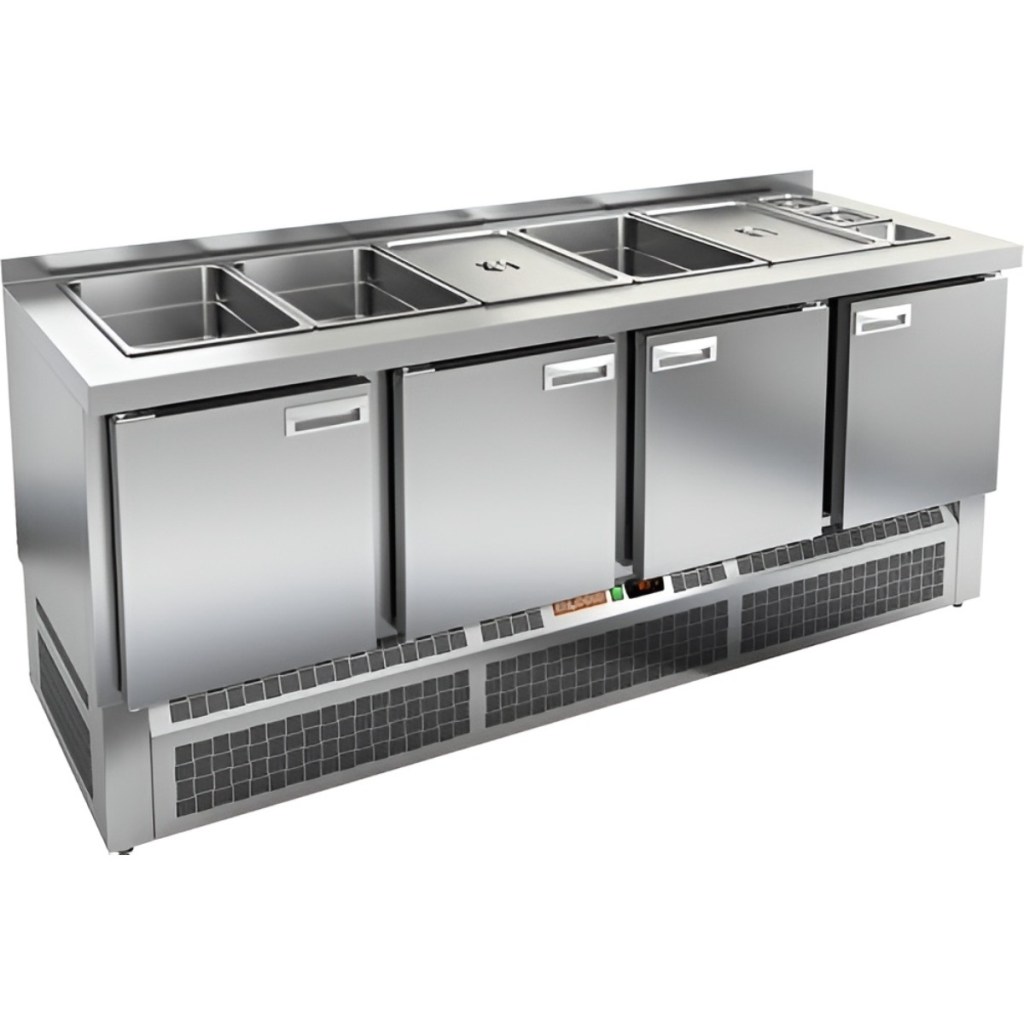 Модель обеспечивает удобный доступ к продуктам и позволяет повару работать максимально эффективно. Корпус и столешница изготовлены из нержавеющей стали, что гарантирует долговечность конструкции, устойчивость к коррозии и соответствие санитарным нормам.