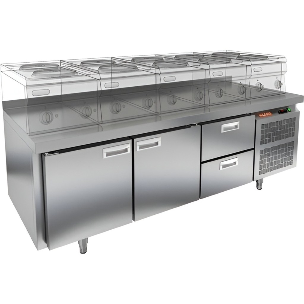 Стол оснащен двумя глухими дверями и двумя выдвижными ящиками для GN2/3, что обеспечивает удобный доступ к продуктам и рациональное использование внутреннего пространства. Оборудование идеально подходит для предприятий общественного питания.