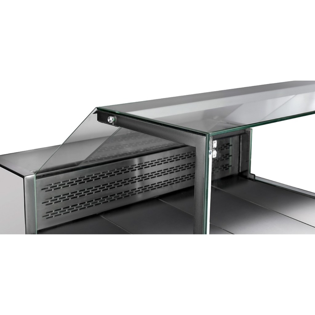 Модель оснащена прямым фронтальным стеклом для удобного обзора товара и LED-подсветкой, которая выгодно выделяет продукцию. Экспозиционная и рабочая поверхности выполнены из нержавеющей стали, обеспечивая долговечность и простоту ухода.